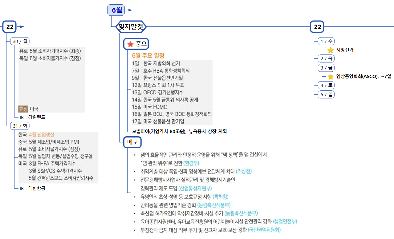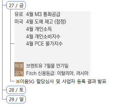미국 연방준비제도(Fed·연준)의 5월 연방공개시장위원회(FOMC) 의사록 발표도 이번 주 예정되어 있다. 연준이 선호하는 물가 지표인 개인소비지출(PCE) 물가 지표도 발표돼 인플레이션 흐름을 파악할 수 있을 것으로 예상된다.