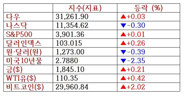 | 지수 | 종가 | 등락폭 | 등락률 | 상승/하락/보합 |