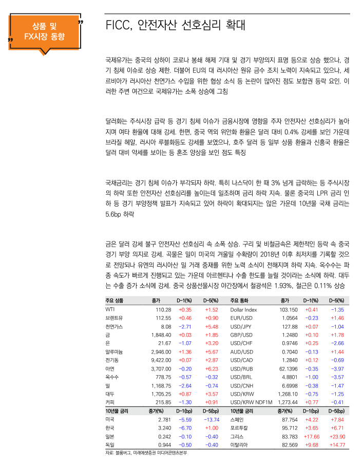▲ 업종/종목 : 낙폭과대 성장주 저가 매수. LG에너지솔루션(+8.4%) 등 셀 메이커와 후성(+34.8%), 엘앤에프(+21.8%), 일진머티리얼즈(+18.1%) 등 2차전지 소재주 강세. 반면 대우조선해양(-14.1%) 러시아 계약 취소 리스크 우려