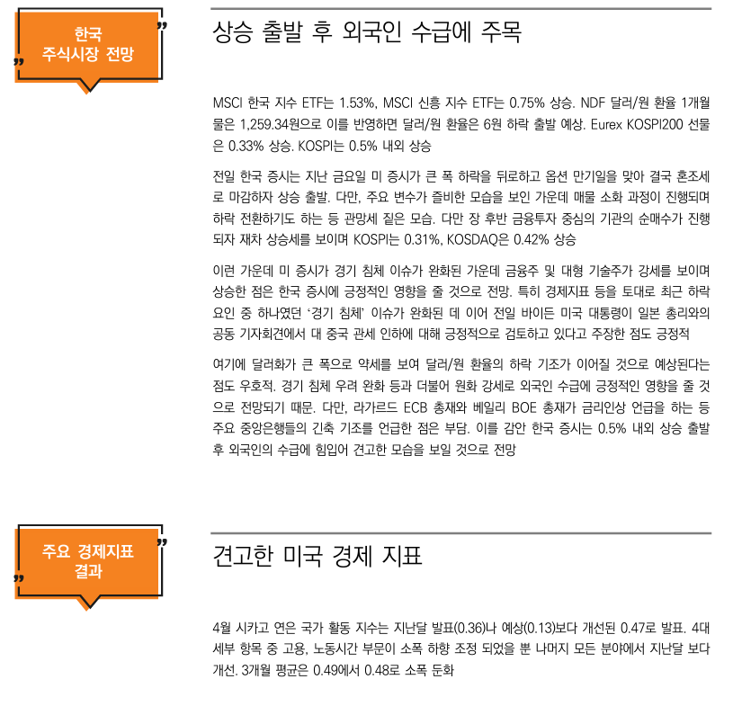 금일 유럽증시는 독일의 경제 지표 호조 등에 상승 마감. 독일의 체감 경기를 보여주는 5월 IFO 기대지수는 시장 예상치인 91.8 포인트를 상회하는 93.0 포인트를 기록하며 독일의 경제 상황이 러시아와 우크라이나 전쟁으로 인한 충격으로부터 완화되었다는 낙관론이 제기, 이에 투자 심리가 개선되며 증시 상승 요인으로 작용. 이에범유럽지수인 STOXX600은 에너지 섹터가 상승을 주도하며 전장 대비 1.3% 상승한 436.54 선에 마감했으며, 독일 DAX 지수와 프랑스 CAC 지수를 포함한 유럽 3대 지수 모두 상승세 시현. 클라우스 볼라베 이코노미스트에 따르면 현재 독일의 경제 상황은 관광서비스 산업을 중심으로 서서히 회복 되고 있다고 언급하며 이는 정부의 코로나19 규제 완화 조치 등에 의한 것으로 해석. 한편 관광서비스업과는 달리 독일의 제조 산업계는 글로벌 공급망 악화에 따른 비용 증가 및 이로 인한 수요 감소를 지목하며 비관론을 제시.