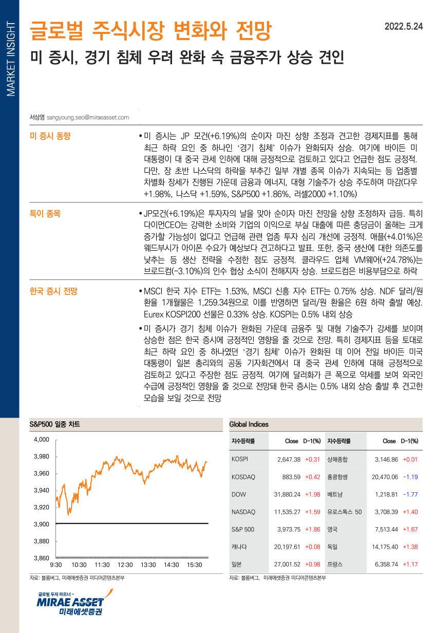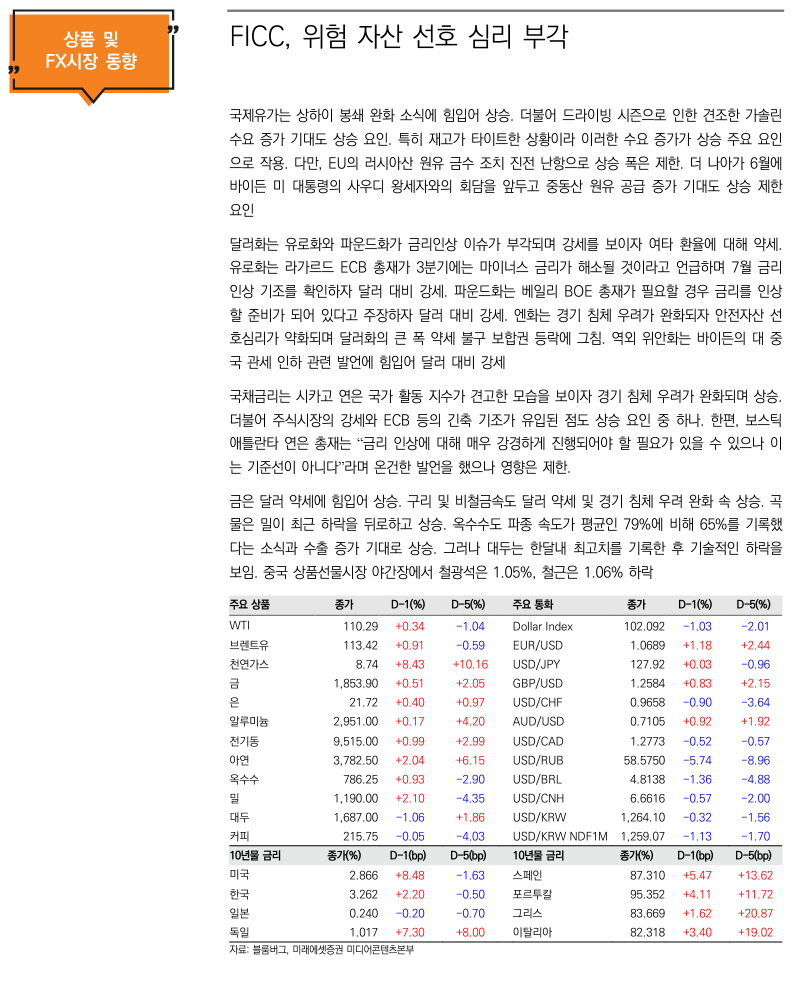 금일 뉴욕 증시는 조 바이든 미국 대통령의 중국 관세 완화 발언이 언급되며 다우지수를 중심으로 상승 마감. 미국 연방준비제도(Fed)의 공격적 긴축 정책 및 인플레이션에 따른 소비감소가 언급되며 다우지수는 1923년 이후 8주 연속 최장기간 하락세를 기록한 가운데 바이든 대통령은 기시다 후미오 일본 총리와의 정상 회담에서 일부 품목에 대한 중국 관세 완화를 검토하고 있다고 언급하며 증시 상승 요인으로 작용. 반면 미국의 투자은행 제프리스의 Sean Darby 전략가에 따르면 소매 섹터를 중심으로 기업의 매출 감소 및 재고 증가로 인한 실적 상황이 지속적으로 악화될 것이라 예상하며 단순히 저가 매수 전략이 아닌 보수적인 투자 전략을 언급. 반면 일각에서는 이러한 지속적인 하락장에서 미연방준비제도의 매파적 스탠스 완화 및 인플레이션 압력 완화에 대한 경제 지표가 발표될 경우 증시 상승 여력으로 작용할 것이란 예상이 언급. 개별 기업으로는 반도체 장비 제조업체 어플라이드 머티리얼스(AMAT)의 코로나19 봉쇄에 따른 공급망 악화가 이번 3분기까지 계속될 것이란 전망이 언급되었음에도 주가는 3.3% 상승한 109.9달러를 기록.