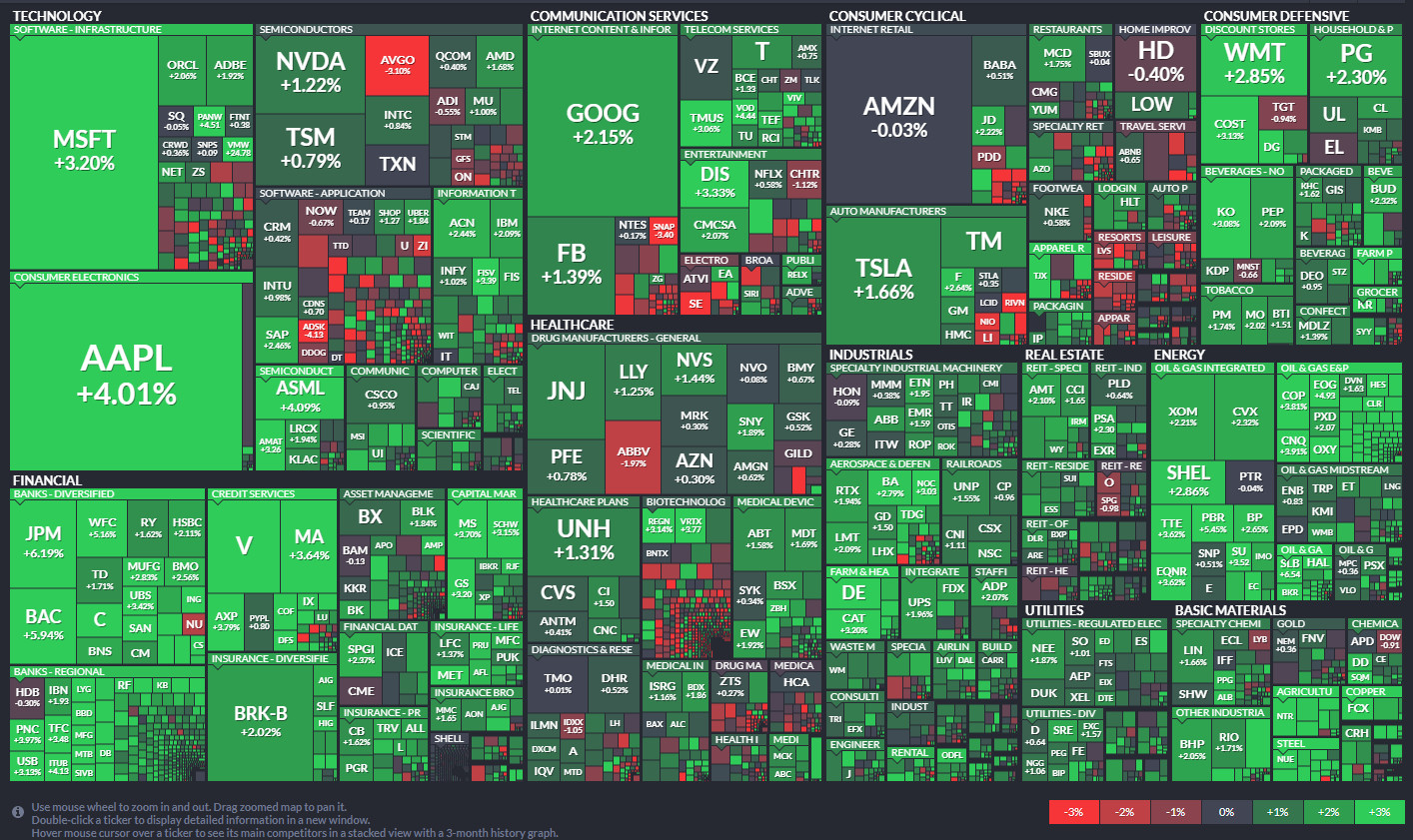알파벳(GOOG)은 1.25% 상승했으며, 마이크로소프트(MSFT) 3.2% 올랐다. 애플(APPL) 주가는 회사가 중국 의존도를 줄이기 위해 인도와 동남아시아 위탁 생산 물량을 늘리는 방안 논의 소식에 4.1% 이상 올랐다.
