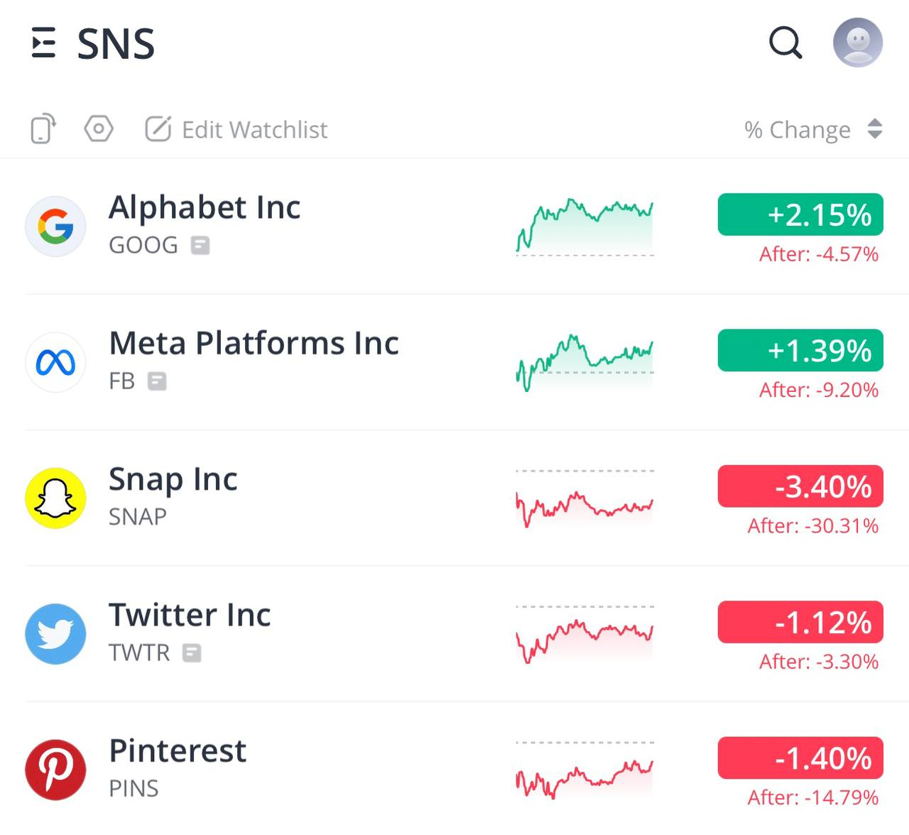•장마감후 Snap CEO 에반스피겔이 직원들에 인플레이션/전쟁/아이폰정책변화 등으로 2분기 가이던스 미달(매출/이익 모두)과 이로인해 채용을 보수적으로 진행할 것이라는 공지를 전달한 것이 알려지며 Snap은 시간외 30%하락 중