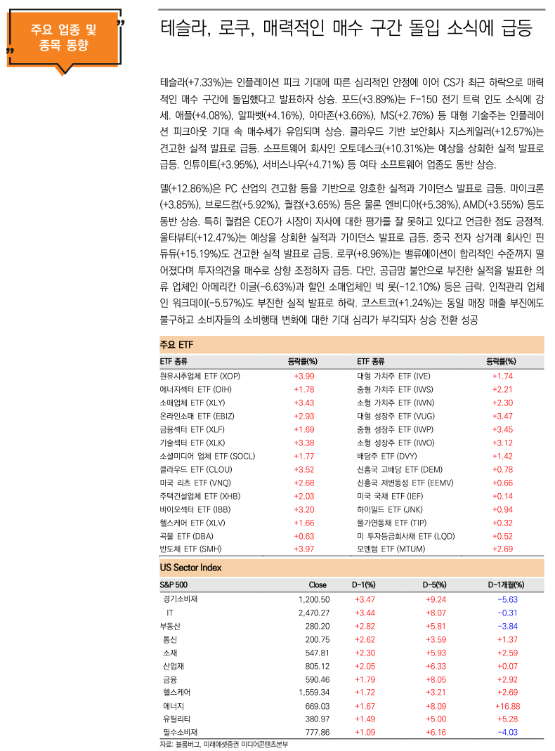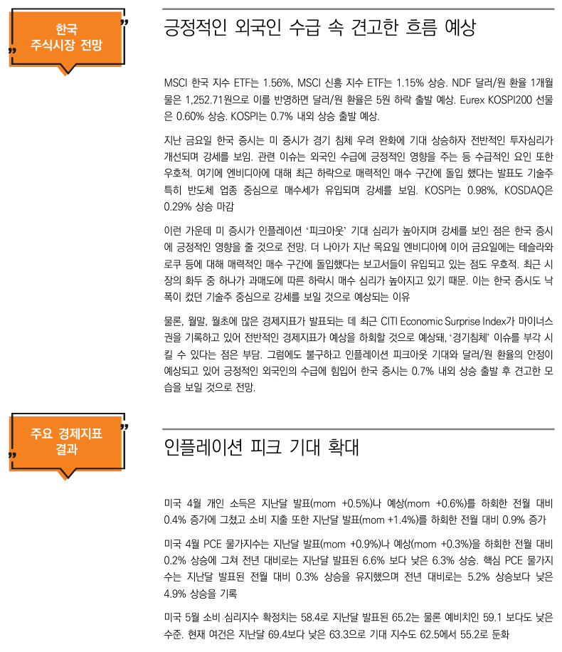 ▲ 주말 해외동향 : 뉴욕증시 2%대 급등 마감. PCE 물가 상승률이 6.3%으로 전월보다 둔화되며 안도랠리 시현. Tesla(+7.5%), NVIDIA(+5.4%) 등 Tech 성장주군 일제 급등했고 마이크론(+3.9%)도 강세