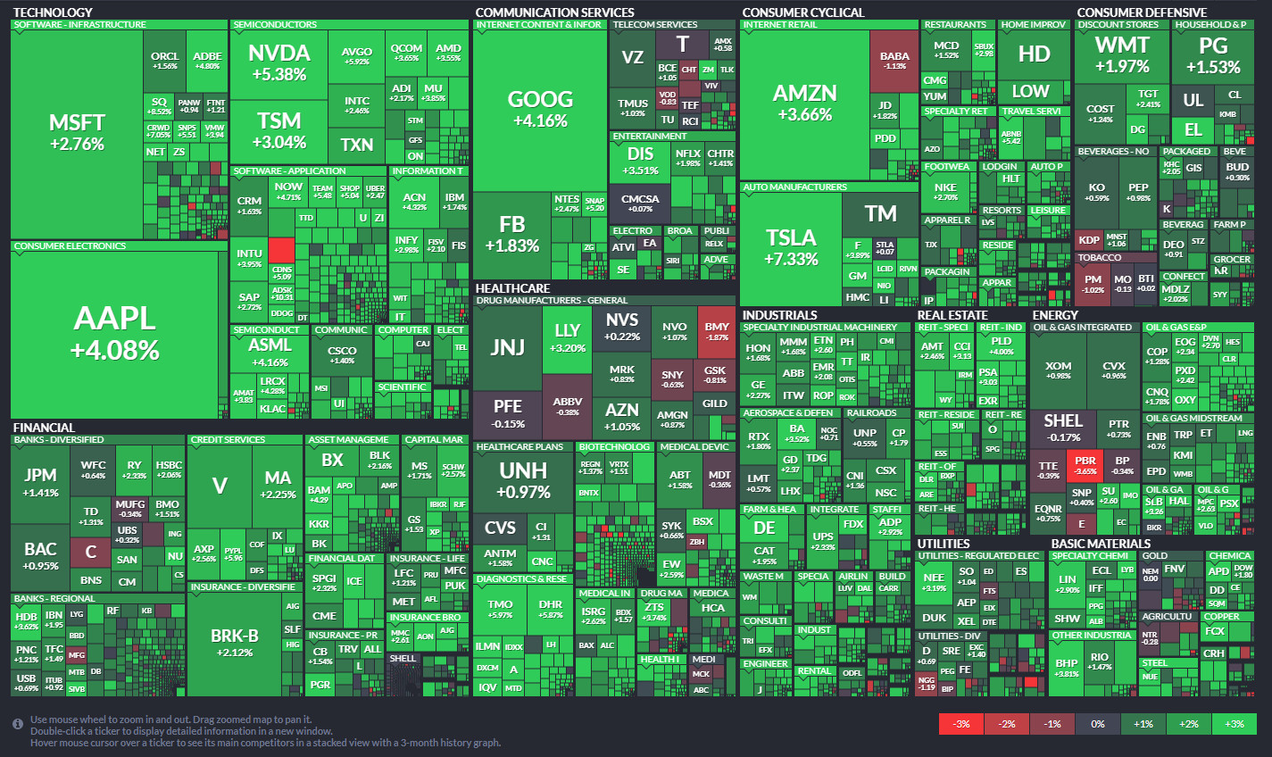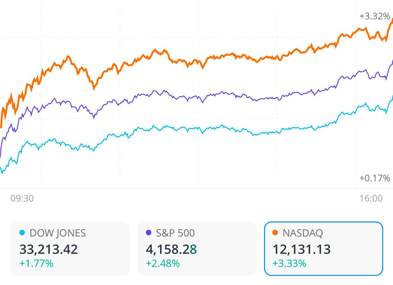 이날 뉴욕증권거래소(NYSE)에서 다우존스30산업평균지수는 전장보다 575.77포인트(1.76%) 오른 3만3212.96으로 거래를 마감했다. 스탠더드앤드푸어스(S&P)500 지수는 전장보다 100.40포인트(2.47%) 상승한 4158.24로, 기술주 중심의 나스닥 지수는 전장보다 390.48포인트(3.33%) 오른 1만2131.13으로 장을 마쳤다.