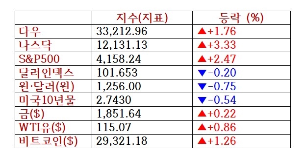 한편 지난 한 주간 다우존스30산업평균지수와 스탠더드앤드푸어스(S&P)500지수, 나스닥지수는 모두 6% 이상 올랐다.다우지수는 8주 연속 하락한 데서 반등했고, S&P500지수와 나스닥지수는 7주 연속 하락한 데서 반등에 성공했다.