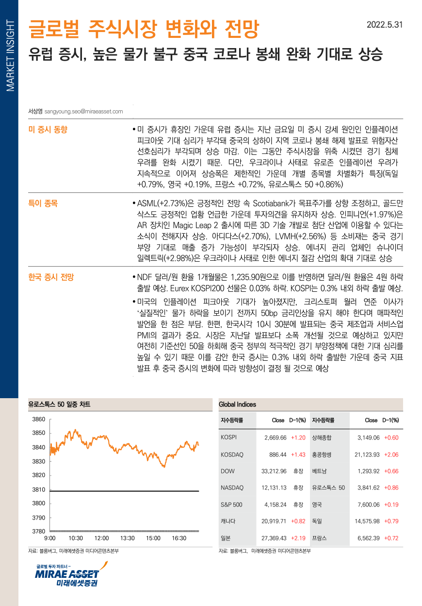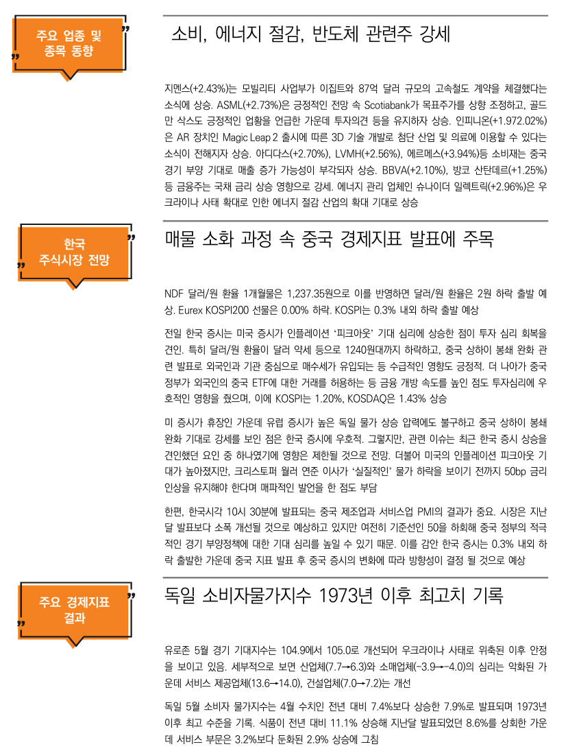 금일 유럽증시는 중국 당국의 경기 부양책에 대한 기대감이 투자심리를 자극하며 소폭 상승마감. 중국 상하이 도시 내 코로나19 확산세가 진정세를보임에 따라 중국 당국은 50개의 지원책이 포함된 56조원상당의 경기 부양책을 발표. 중국의 이러한 경기부양으로 투자심리가 상승하며 지난주에 이어 유럽 증시는상승랠리를 지속, 이에 범유럽지수인 STOXX 600은 자유소비재 섹터가 상승을 주도하며 0.6% 상승한 446.6선에서 거래를 마감했으며 영국FTSE 지수와 프랑스CAC 지수를 포함한 유럽의 3대 지수 모두 상승 마감. 또한 주요한 금속 소비국인 중국 경제가 이번 경기 부양책으로 인해 회복할 것이란 분석이 언급되며 니켈 및 구리를 포함한 주요 금속 가격의 상승 모멘텀으로 작용. 한편 유럽연합(EU)의최고 의사결정기구인 유럽이사회에 따르면 이르면 이달 30일부터 러시아 파이프라인을 제외한 러시아산 원유금수 조치에 합의할 것으로 전망하며 국제유가의 주된 상승 요인으로 작용하였으며 이번 중국의 경기 부양책이 발표되며 유가 상승 압력을 더욱 가중.