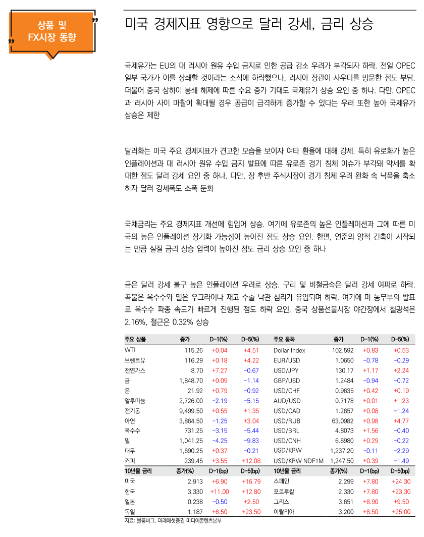 뉴욕 증시는 글로벌 매크로 환경 및 유가 변동성 확대로 혼조세 마감. 또한 금일 발표된 미국의 5월 제조업 구매관리자지수(PMI)는 전월 대비 0.5하락한 57.0을 기록, 4개월만에 최저치를 기록하며 증시 하방 압력을 가중. 한편 일각에서는 인플레이션이 고점에 이르러 점차 둔화하고 있다는 전망이 제시되었으나 유럽연합(EU)의 러시아산 원유 금수 조치 및 중국의 코로나19 봉쇄 해제에 따른 에너지 수요 증가가 예상되며 국제 유가는 여전히 배럴당 100달러 이상을 상회, 인플레이션 압력을 심화시키는 주요한 원인으로 작용. 다국적 금융 서비스 기업 웰스파고는 2023년 말까지 1조 5천억 달러 가량이 미국 연방준비제도(Fed)의 양적 긴축(QT)을 통해 축소될 것이며 이를 통해 0.75% 이상의 기준금리 인상 효과를 일으킬 것이라 전망. 이러한 상황에서 모건스탠리는 올 하반기 원유를 비롯한 주요 원자재 가격이 강세를 시현할 것이라 언급. 특히 원자재 섹터 투자를 통해 인플레이션 헤지 전략을 구축할 수 있으며 향후 글로벌 공급망 회복이 이루어질 경우 원자재에 대한 수요는 꾸준히 증가할 것으로 예상. 개별기업으로는 메모리 반도체에 대한 수요가 견고하다는 분석이 언급되며 DRAM 및 플레시 메모리 반도체 제조기업 마이크론 테크놀로지(MU/-0.4%)의 수익성 향상이 주목.