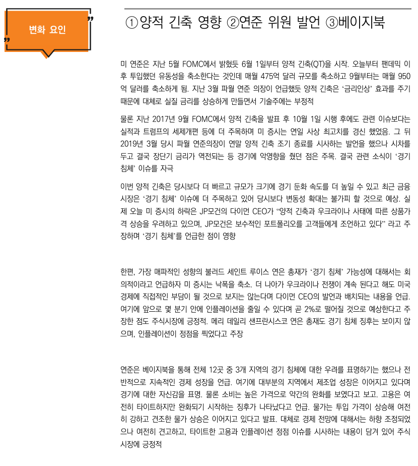 •전일 조정을 딛고 +1%수준의 강세로 시작한 증시는, $95b규모의 QT시작과 불확실한 경제에 대한 우려가 다시금 부각되며 나스닥 성장주에 대한 매도세가 하루종일 이어지져 결국 주요지수 모두 하락 마감