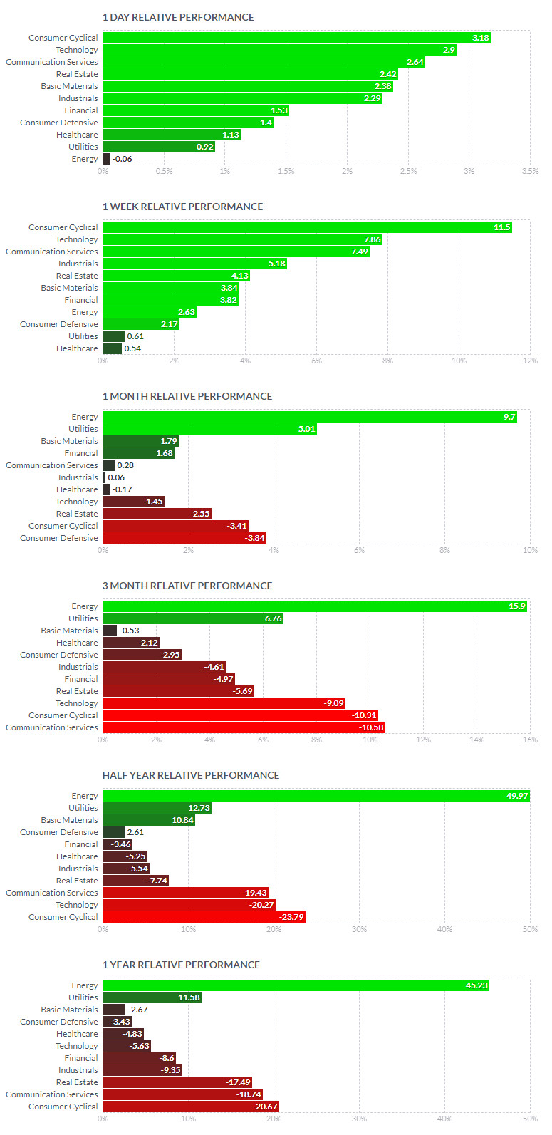 한편 이날 S&P500지수 내 에너지 관련주만이 소폭 하락하고 나머지 10개 업종이 모두 올랐다. 임의소비재와 자재(소재), 통신, 기술, 산업 관련주들이 모두 1% 이상 상승했다.