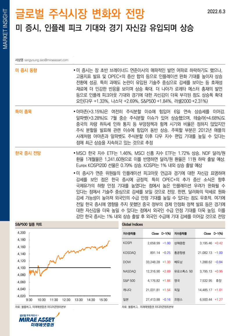 뉴욕 증시는 석유수출국기구(OPEC) 및 러시아를 포함한 주요 산유국들의 협의체인 OPEC+의 원유 증산 합의가 이루어 지며 상승 마감. 또한 금일 발표된 5월 신규 실업수당청구건수는 시장 예상치를 소폭 하회하며 미국연방준비제도(Fed) 통화 긴축 속도 조절에 대한 기대감이 상승, 이에 증시 상승 압력을 가중. 한편 연방준비제도(Fed)의 레이얼 브레이너드 부의장은 현재 인플레이션 압력 완화를 최우선 과제라고 언급하며 현재 인플레이션을 목표치인 2% 대까지 낮추기 위한 지속적인 기준금리 인상 필요성을 언급. 일각에서는 임금 상승이 인플레이션 상승 속도를 따라가지 못하며 이로 인해 소비자들의 구매력을 하락시키고 있다는 평가가 제기. Wolfe Research의 Chris Senyek 전략가에 따르면 인플레이션 압력 상승으로 인한 소비자들의 구매력 감소 및 기업들의 비용 증가로 인한 실적 하락이 맞물리며 향후 추가적인 증시 하락에 대한 대비 필요성을 역설. 개별 기업으로는 휴렛 패커드 엔터프라이즈(HPE)의 시장 경쟁력에 대한 실적 하락 가능성이 예상되며 주가는 5.2% 하락한 14.9 달러를 기록. 특히 기업들의 PC수요가 견고함 에도 불구하고 경쟁사에 비교하여 당사의 점유율 하락에 따른 실적 컨센서스 하향 조절이 제기.