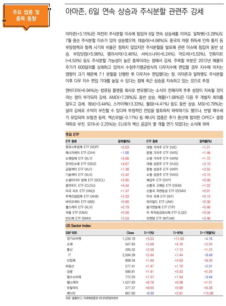 섹터별 ETF는 산업재(XLI/+1.9%)섹터와 자유소비재(XLY/+3.1%)섹터가 상승 마감. 모건스탠리의 Ravi Shanker 애널리스트에 따르면 미국의 운송업체 페덱스(FDX)의 실적 하락이 당사의 주가 하락에 크게 기인하지는 않을 것이라 언급하며 페덱스의 장기 시장기회를 긍정적으로 평가. 또한 과거 흐름을 고려하였을 때 내년 실적 가이던스는 월스트리트의 예상치에 부합할 것이라 전망, 이에 주가는 1.3% 상승하며 산업재 섹터의 상승압력을 지지. 자유소비재 섹터에서는 미국의 페스트푸드 체인 업체 치포틀레 멕시칸 그릴(CMG/+1.6%)의 메뉴 가격 인상으로 인한 고객 이탈 가능성 및 인건비 인플레이션 등 불확실성이 기존 주가에 이미 반영 되었다는 분석이 제기되며 주가 상승 요인으로 작용.