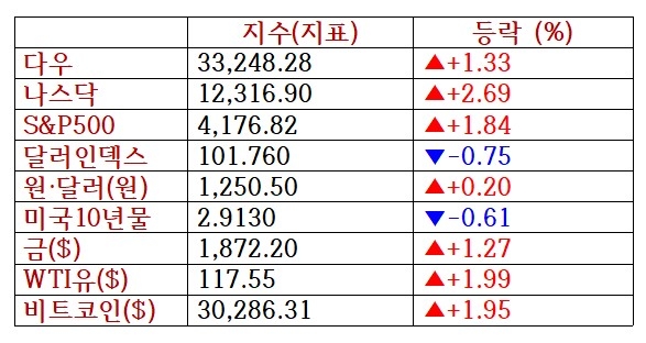 뉴욕증권거래소(NYSE)에서 다우존스30산업평균지수는 전장보다 435.05포인트(1.33%) 오른 33,248.28로 거래를 마쳤다. 스탠더드앤드푸어스(S&P)500지수는 전장보다 75.59포인트(1.84%) 상승한 4,176.82로, 기술주 중심의 나스닥 지수는 전장보다 322.44포인트(2.69%) 뛴 12,316.90으로 장을 마감했다.