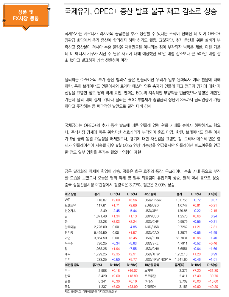 유럽증시는 럭셔리 브랜드를 중심으로한 자유소비재 및 산업재 종목들이 강세를 시현하며 반등을 시도하였으나 인플레이션 압력 상승에 따른 경기침체 우려가 맞물리며 혼조세 마감. 이에 범유럽지수인 STOXX600은 산업재 섹터가 상승을 주도하며 전장 대비 0.6% 상승한 441.2 선에 마감했으며, 영국 FTSE 지수를 제외한 독일 DAX 지수와 프랑스 CAC 지수는 상승 마감. 뉴욕타임즈에 따르면 유럽이 러시아산 에너지 수입을 금지하면서 국제 유가 상승의 주요한 원인으로 지목. 반면 현재 러시아와 우호적인 관계를 유지하는 인도와 중국은 러시아산 원유를 낮은가격으로 수입할 수 있게 되면서 사우디아라비아와 러시아를 중심으로 한 석유수출국기구(OPEC) 플러스 내의 분열에 대해 우려를 표명. 또한 RBC캐피털은 최근 보고서를 통해 인도에서 정제된 디젤을 유조선을 이용하여 유럽으로 수출될 경우 송유관을 통한 러시아산 원유보다 물류비용이 증가할 것이라고 전망하며 향후 추가적인 유가 상승 가능성을 언급.