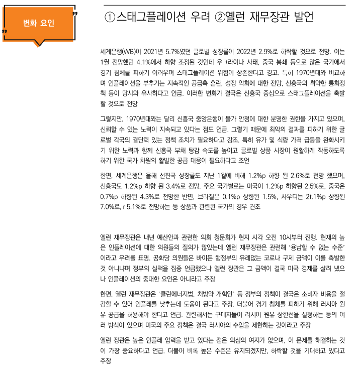 한편 인플레이션에 대한 우려도 지속됐다. 이날 재닛 옐런 미 재무부 장관은 미국 상원 금융위원회 청문회에 출석해 "인플레이션이 떨어지기를 간절히 바라고 있지만, 높은 수준을 유지할 것으로 예상한다“며 "인플레이션이 받아들이기 힘든 수준"이라고 전했다. 또 연방준비제도(Fed, 연준)의 통화 긴축과 함께 이를 보완할 적절한 재정정책이 필요하다고도 덧붙였다.