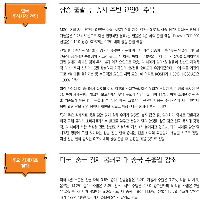 섹터별 ETF는자유소비재(XLY/-0.3%)섹터는 하락한 반면 헬스케어(XLV/+1.3%)섹터는상승 마감. 미국의 소매 판매 업체 타켓(TGT)은 인플레이션압력 심화에 따른 소비 위축이 가시화 되며 재고 축소를 위한 제품 가격 인하 및 주문 축소 등의 조치를 단행할 것으로 발표. 이에 따라 당사의 2분기 영업 마진율은 2%대를 예상하며 기존 예상 수준보다 낮아질 것으로 전망, 이에 주가는2.3% 하락한 156달러를 기록하며 자유소비재 섹터의 하방압력을 가중. 한편 헬스케어 섹터에서는 제약업체 일라이 릴리(LLY/+2.9%)의비만 의약품에 대한 체중감량 성과를 발표하며 주가 상승 요인으로 작용. 해당 임상 실험을 통해 평균체중이 5% 이상 감량 되었으며 대조군과 비교하여 유의미한 수치를 기록. 해당 제품을 통한 당사의 성장 잠재력이 주목되며 헬스케어 섹터의 상승을 주도.