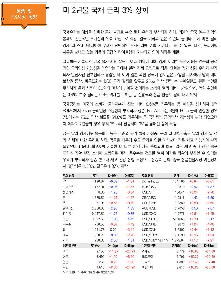 금일 뉴욕 증시는 시장 예상치를 상회하는 미국의 소비자물가지수(CPI)로 경기 침체에 대한 우려가 상승, 투자심리에 충격을 주며 하락 마감. 이번 발표된 미국의 5월 소비자물가지수는 월스트리트의 예상치인 8.3%를 상회하는 전년 대비 8.6%를 기록하며 1981년 이후 41년 만에 최고치를 경신. 이에 기술주 중심의 나스닥 지수와 S&P500지수를 포함한 3대 지수 모두 지지선이 깨지며 2.5% 이상 크게 하락. 에너지 및 식음료 가격을 주도로 전방위적인 물가 상승 압력이 점차 심화되며 미국 연방준비위원회(Fed)의 기존 긴축 통화정책에 대한 변화가 있을지 시장은 주목. 글로벌 투자은행 RBC Capital은 이번 발표된 물가 지표를 통해 경기 침체에 대한 투자자들의 공포를 재확인할 수 있다며 연방준비제도의 긴축 완화에 대한 가능성은 희박하다고 평가. 한편 국제 유가는 여름철을 맞아 원유 수요 증가가 예상되는 상황에서 산유국들의 증산 조치들이 실제 원유 공급 정상화를 이끌어 낼지 불확실 하다는 관측이 제기. 하지만 중국 당국의 코로나19 봉쇄령이 일부 상하이 지역에 재실시 되면서 이러한 국제 유가 상승 압력을 완화, 이에 7월물 미국 서부텍사스원유(WTI)는 1.1% 하락한 배럴당 117.8달러를 기록.