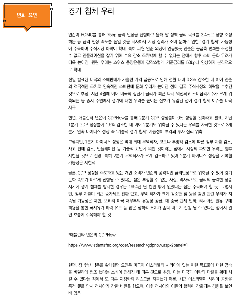 •전일 FOMC의 금리인상폭은 시장이 예상 or 기대하는 수준(75bp)이었지만, 어쨌거나 결국 금리를 단기에 많이 인상할수록 경기침체에 가까워질 가능성이 높다는 우려가 시장 지배 (경기침체=기업실적 하락)