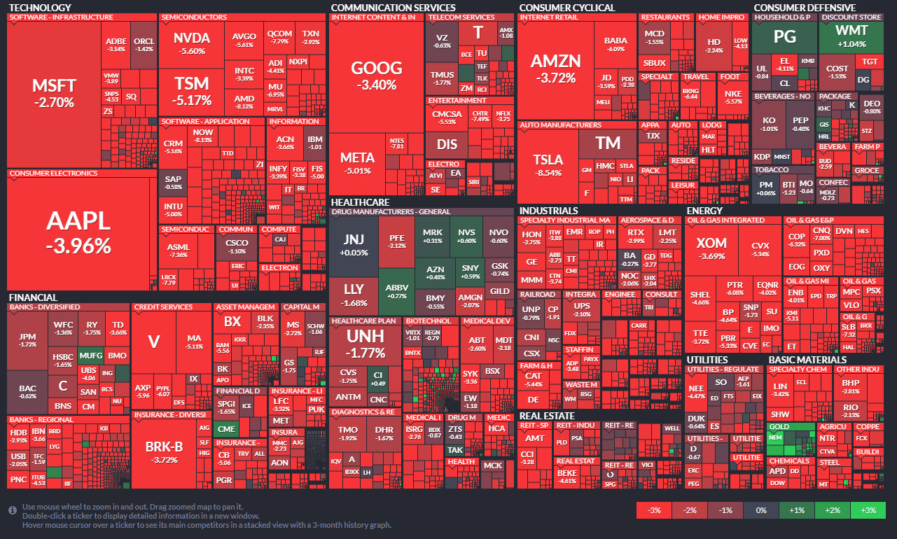 주요 빅테크 주가는 하락세를 보였다. 부터 폭락했다. 애플과 아마존은 각각 3.97%, 3.72% 떨어졌고 마이크로소프트(-2.70%), 알파벳(구글 모회사·-3.40%), 테슬라(-8.54%), 메타(페이스북 모회사·-5.01%) 모두 줄줄이 떨어졌다.