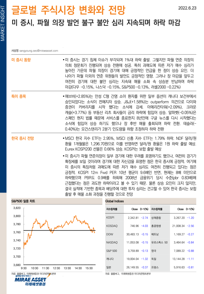 금일 뉴욕증시는 미 연준(FED) 제롬 파월 의장의 의회 증언을 주목하며 하락 마감. 이날 연준 의장은 상원 은행위원회에 참여함으로써 금리를 앞으로도 인상할 것이라고 재차 강조하였으며, 인상 폭은 앞으로의 경제지표와 전망에 따라 결정할 것이라고 언급. 이어 당분간 인플레이션이 2% 대의 목표치로 낮아질 때까지 지속적인 금리 인상을 진행할 것이라고 언급. 골드만삭스는 미국의 경기침체 가능성을 30%로 상향조정 하였으며, 씨티그룹 또한 경기침체 가능성을 50% 로 상향 조정. 월스트리트저널이 이코노미스트들을 상대로 조사한 바에 따르면 앞으로 12개월 내 미국 경제가 침체에 직면할 가능성이 44%로 지난 달의 28% 비해 상향 조정.