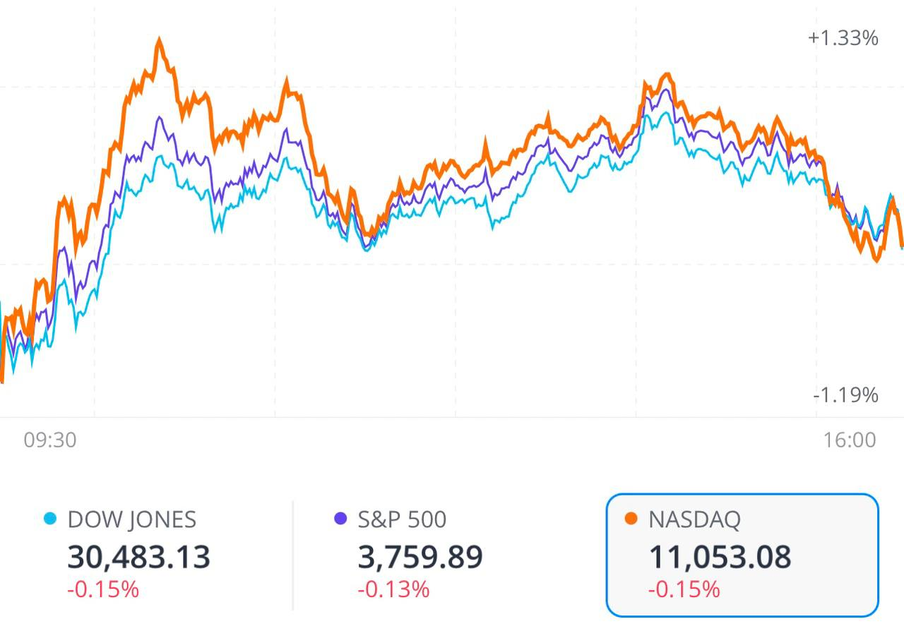 뉴욕증시는 22일(현지시간) 하락했다. 뉴욕증권거래소(NYSE)에서 다우지수는 전 거래일 대비 47.12포인트(0.15%) 하락한 3만483.13에 마감했다. S&P500지수는 4.90포인트(0.13%) 하락한 3759.89에, 기술주 중심의 나스닥지수는 16.22포인트(0.15%) 내린 1만1053.08에 거래를 마쳤다.