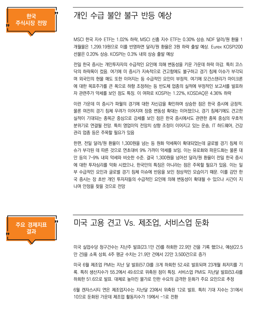 •조만간 2분기 실적 시즌에 진입할 예정이며, 특히 7월25일 전후로 빅테크의 2분기 실적발표시점과 FOMC 일정이 겹치며 변동성이 크게 확대될 가능성 유의