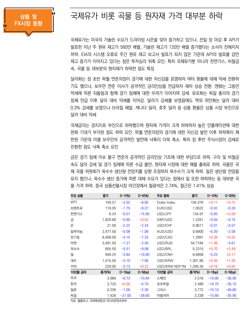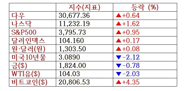 경기침체 우려로 채권시장에서 기준물인 미 10년물 국채 수익률이 전일비 0.067%p 급락한 3.089%로 떨어지는 등 전반적인 시장 분위기는 좋지 않았다. 그러나 저가 매수세가 유입되며 주식시장이 상승세를 탔다.