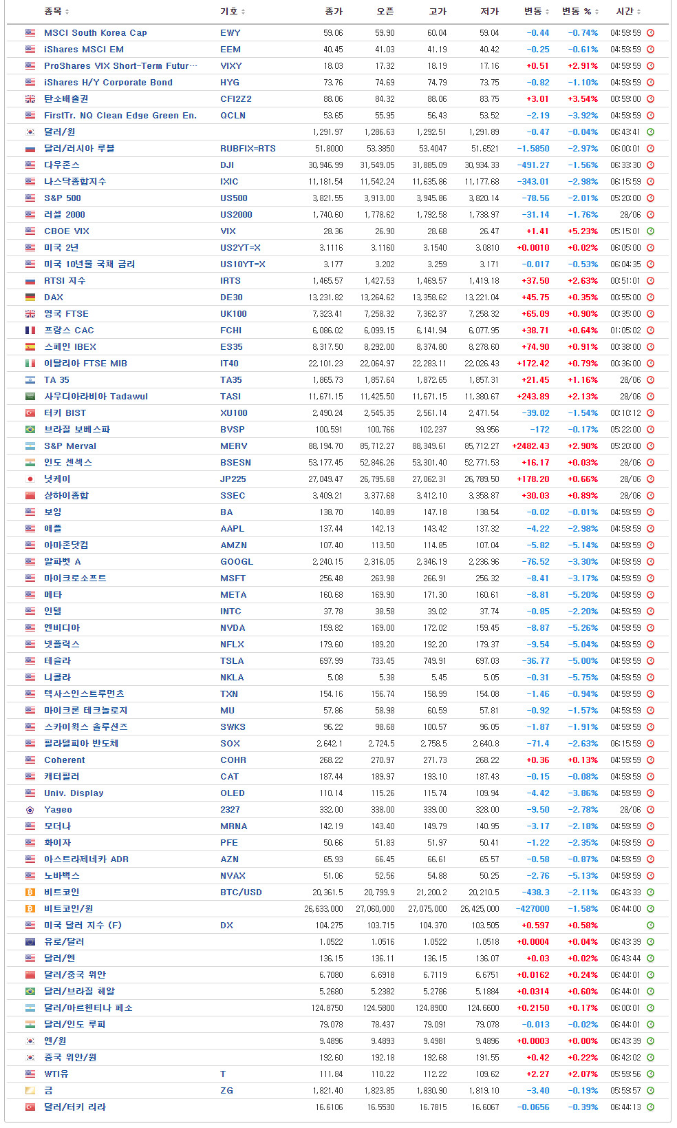 [글로벌시장 지표 / 6월 29일 오전 6시 현재]