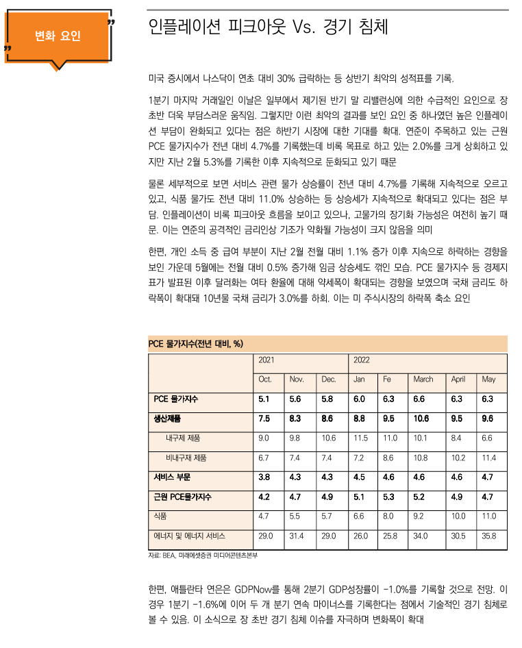 인플레이션 지표가 여전히 1980년대 초 수준의 고공행진을 이어가면서 투자 심리가 쪼그라들었다. 미국 상무부에 따르면 올해 5월 개인소비지출(PCE) 가격지수는 전년 동월 대비 6.3% 상승했다. 월가 예상치(6.4%)는 소폭 하회했다. 그러나 여전히 1980년대 초 수준의 고물가다. 변동성이 큰 에너지, 식료품을 제외한 근원 PCE 가격지수는 1년 전과 비교해 4.7% 올랐다.