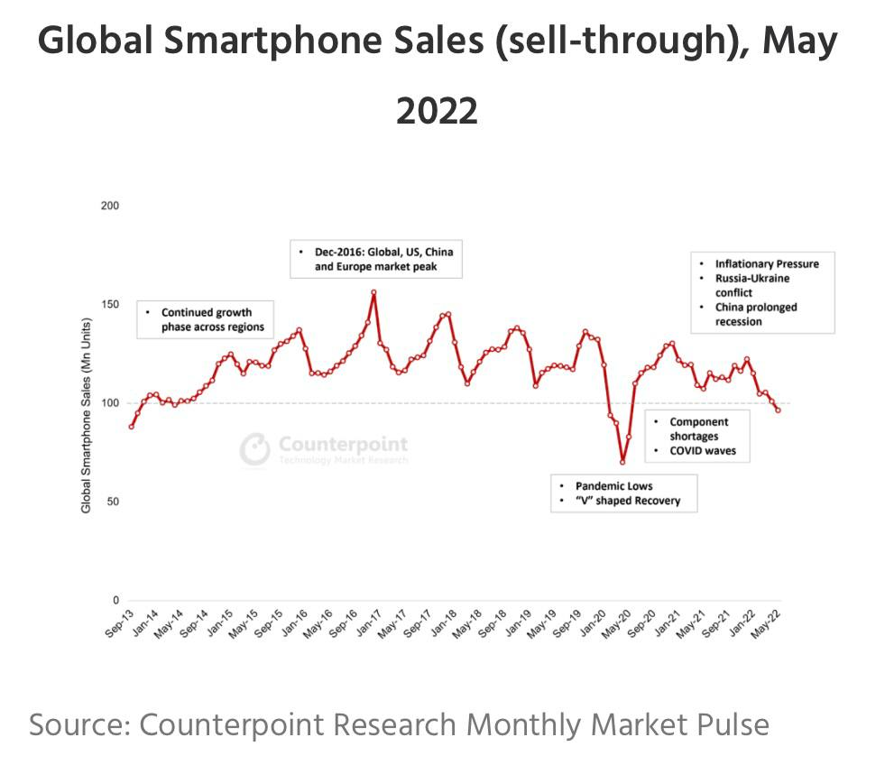 ~ The Global Smartphone Market sales declined 4% Month on Month (MoM) and 10% Year on Year (YoY) in May 2022 to 96 million units, according to Counterpoint Research’s Market Pulse Service. This was the second consecutive month of MoM decline and the 11th consecutive month of YoY sales decline