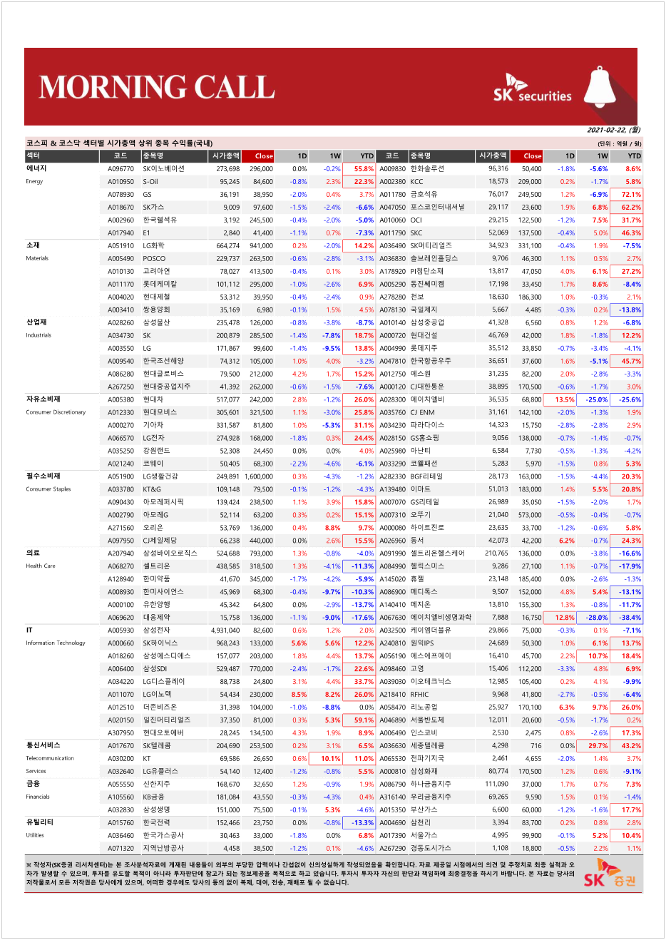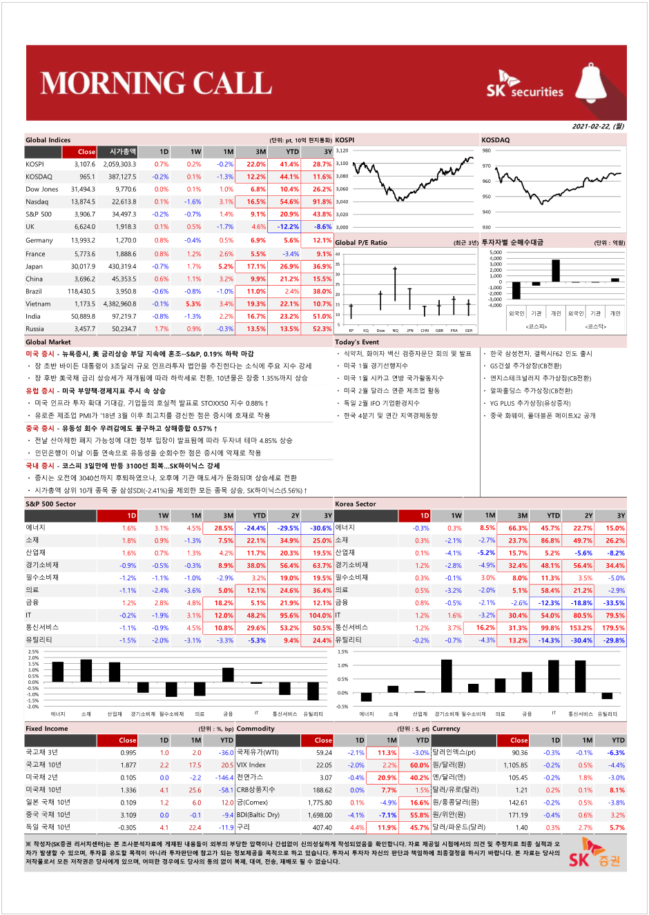 지난 금요일 한국 증시는 인민은행의 800억 위안 유동성 흡수 소식이 전해진 이후 매물 출회되며 낙폭을 확대하기도 했음. 그렇지만 민주당이 1.9조 달러 규모의 부양책 처리 후 3조 달러 규모의 인프라 투자를 위한 추가적인 부양책을 내놓을 것이라는 소식이 전해지자 상승 전환하며 마감. 이런 가운데 금요일 미 증시는 부양책 이슈로 상승 출발 했으나 금리 상승에 대한 우려로 인플레 관련 업종이 강세를 보였으나 기술주 등이 부진한 업종 차별화를 보임. 한편, 중소형지수가 2% 넘게 급등한 점, 반도체 지수 또한 2% 넘게 급등해 한국 증시는 0.5% 내외 상승 출발 할 것으로 기대.