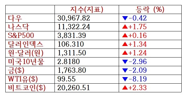 이날 뉴욕증권거래소(NYSE)에서 스탠더드앤드푸어스(S&P)500지수는 전일 대비 6.06포인트(0.16%) 오른 3831.39로 마감했다. 나스닥종합지수는 전일 대비 194.39포인트(1.75%) 뛴 1만1322.24로 장을 마쳤다. 반면 다우존스산업평균지수는 전장 대비 129.44포인트(0.42%) 내린 3만967.82로 거래를 마쳤다.
