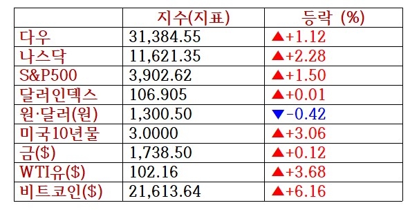 뉴욕증시의 다우존스30 산업평균지수는 전장보다 346.87포인트(1.12%) 오른 31,384.55에 거래를 마쳤다. 스탠더드앤드푸어스(S&P) 500 지수는 57.54포인트(1.50%) 뛴 3,902.62에, 기술주 중심의 나스닥 지수는 259.49포인트(2.28%) 급등한 11,621.35에 각각 장을 마감했다.