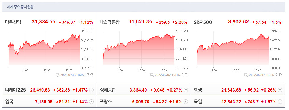 여기에 경제지표, 특히 고용지표가 주가 상승세 발판 역할을 했다. 미국의 지난주 주간 신규실업수당 신청자 수가 1월 이후 최대 수준인 23만5000명으로 4000명 늘고, 민간기업들의 6월 감원 발표는 2월 이후 최대 수준인 3만2517명으로 57% 폭증했다는 소식이 인플레이션(물가상승) 완화 기대감을 끌어올린 것이다. 이처럼 인플레이션 오름세가 둔화되면 미국 연방준비제도(연준)의 금리인상 흐름 역시 한 풀 꺾일 것이라는 기대감이 작용했다.