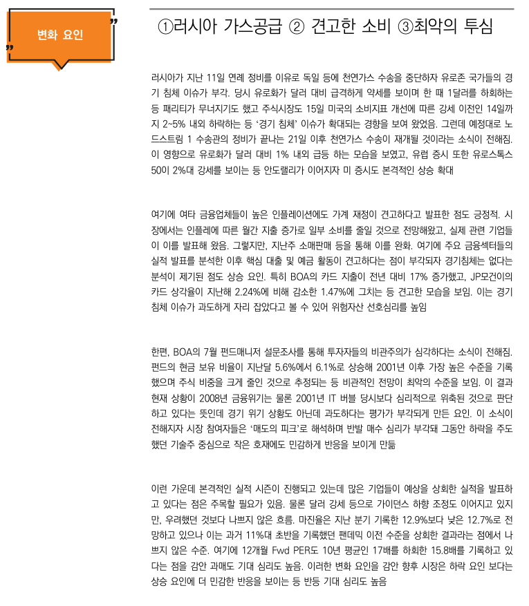 미국 증시는 위험 선호 심리 회복에 상승 마감. S&P500지수는 2.8% 상승한 3.936.69선에서 거래를 마쳤고, 다우지수는 31,827.05에 마감. 나스닥 지수는 3.1% 상승한 11,713.15에 마감. 지난 2분기 실적 시즌에 따라 기업들이 실적을 공개하고 있는 가운데 작일 애플(AAPL)이 잠재적 경기 둔화의 대응책으로 일부 부서의 고용과 지출 확대를 둔화시킬 계획이라는 보도가 이어지며 주가에 하방 압력이 가해졌지만, 금일 다른 기업들의 기존의 시장 예상치를 상회하는 기록들의 공개되며 증시에 상승 압력. 이에 따라 월 스트리트의 전문가들은 미국이 올해 경기 침체에 접어들지 않을 것이라는 예상에 무게를 두는 추세. 전문가들은 올해 하반기에 인플레이션이 고점에 이르고 유가가 하락할 것이라고 전망하며 미 연준(Fed)가 올해 안에 금리 인상을 중단할 것이라고 예측. 금일 발표된 경제지표로는 미국의 6월 신규주택 착공이 전월대비 2.0% 하락하며 2개월 연속 하락세를 기록하며 주택시장이 둔화 조짐을 보였고 미국 애틀란타 연은의 미국 2분기 GDP 성장률 전망이 -1.6%로 하향 조정.