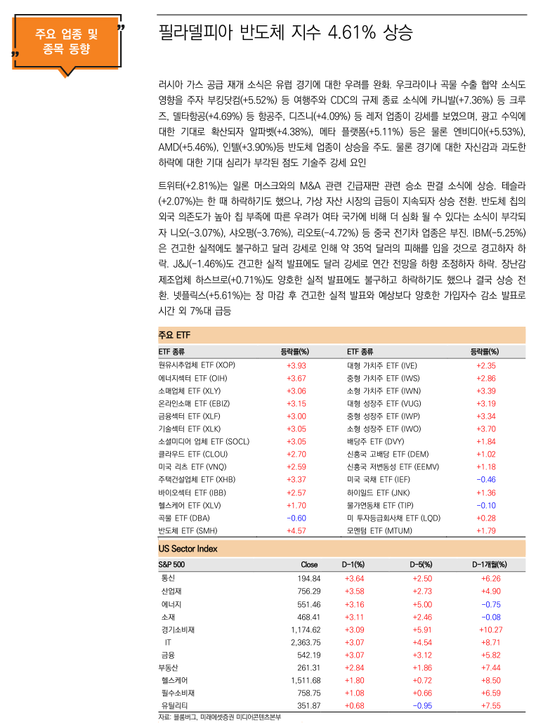 | PHLX 반도체지수 | 2,803.14 | 123.57 | 4.6% | 30/0/0 |