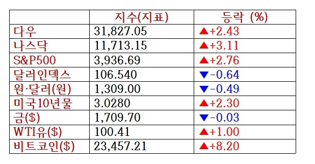 테슬라가 2.0% 상승한 것을 비롯해 애플 2.6%, 엔비디아 5.5%, AMD 5.4%, 아마존닷컴 3.9%, 마이크로소프트 2.0%, 넷플릭스 5.6%, 메타 5.1%, 구글의 알파벳이 4.2% 급등한 채 마감했다.