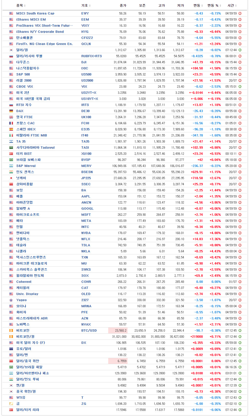 [글로벌시장 지표 / 7월 21일 오전 6시 현재]
