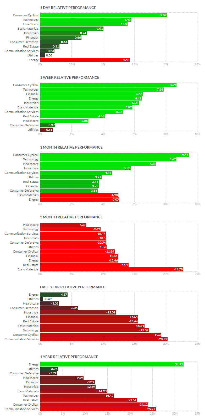 | 커뮤니케이션 | XLC | 58.0 | -0.1% | 햇빛 | 1.9% | -1.1% | -29.5% |
