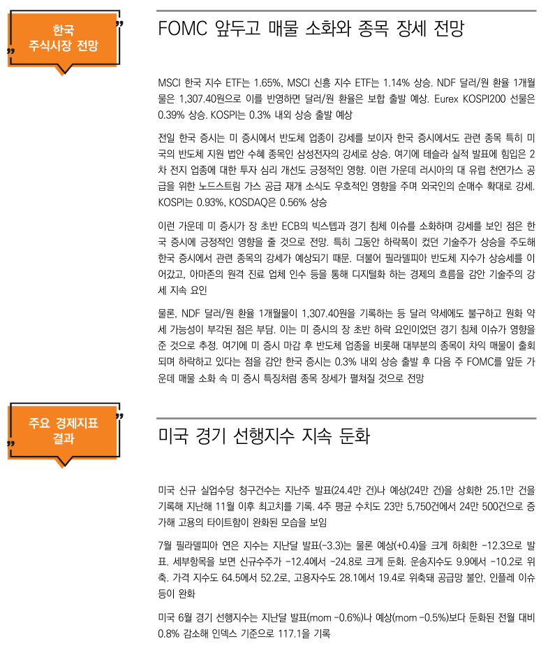 미국 증시는 유럽 금리 인상의 영향 속에 상승 마감. S&P500지수는 1.0% 상승한 3.998.95선에서 거래를 마쳤고, 다우지수는 32,036.90에 마감. 나스닥 지수는 1.4% 상승한 12,059.61에 마감. 미국 내 상장기업들이 호조의 실적 발표를 이어감에 따라 안도 랠리를 이어가던 금일 뉴욕증시는 유럽의 11년만의 금리인상 결정으로 인하여 상승폭이 제한되며 상승세로 전환. 유럽의 통화정책에 따라 유로화의 강세가 이어졌고 달러화가 약세를 시현. 금일 발표된 경제지표 또한 미국 증시의 상승세를 제한. 금일 미국의 6월 경기 선행지수가 전월 대비 0.8% 하락하며 4달 연속 하락을 기록. 또한, 미국의 7월 필라델피아 연은 제조업지수가 -12.3으로 급락하며 제조업 경기가 위축세로 전환됐음을 시사. 마지막으로 미국의 주간 실업보험 청구건수가 8개월만의 최대치로 접어들며 노동시장의 과열세가 식기 시작했다는 평가가 이어졌지만, 기업들이 감원을 단행하며 노동 공급이 줄어들었다는 분석. 한편, 뱅크오브아메리카(BoA)는 미국 경제에 대하여 이미 온건한 침체에 들어섰다고 언급.