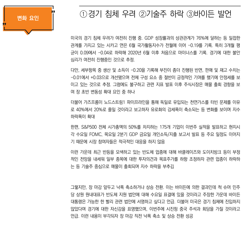 금일 미국 증시는 혼조세로 마감. S&P500지수는 0.1% 상승한 3.966.84선에서 거래를 마쳤고, 다우지수는 31,990.04에 마감. 나스닥 지수는 0.4% 하락한 11,782.67에 마감. 금일 투자자들은 미국 연방공개시장위원회(FOMC) 정례회의, 공개될 GDP데이터, 기업들의 긍정적인 실적 공개가 증시에 상승 동력을 줄 것이라는 기대 속에 숨 고르기를 하며 혼조세로 마감. 특히 GDP지표는 경기 침체의 비공식적인 시그널을 나타낼 것이라는 분석. 또한, 곧 열리는 연방공개시장위원회 회의에서 75bp의 기준금리 이상이 결정될 것이라는 의견이 지배적인 가운데 회의 결과에 투자자들의 관심이 집중. 전문가들은 미 연준(Fed)이 경기 침체에 이르더라도 인플레이션 제어를 위해 기준 금리 이상 속도를 늦추지 않을 것이라고 예상. 금일 발표된 경제지표로는 미국 6월 시카고 연은 전미활동지수가 -0.19로 발표되며 두달 연속 마이너스 수치를 기록. 이는 현재 미국 경제가 장기 평균 수준보다 부진하다는 점을 시사.