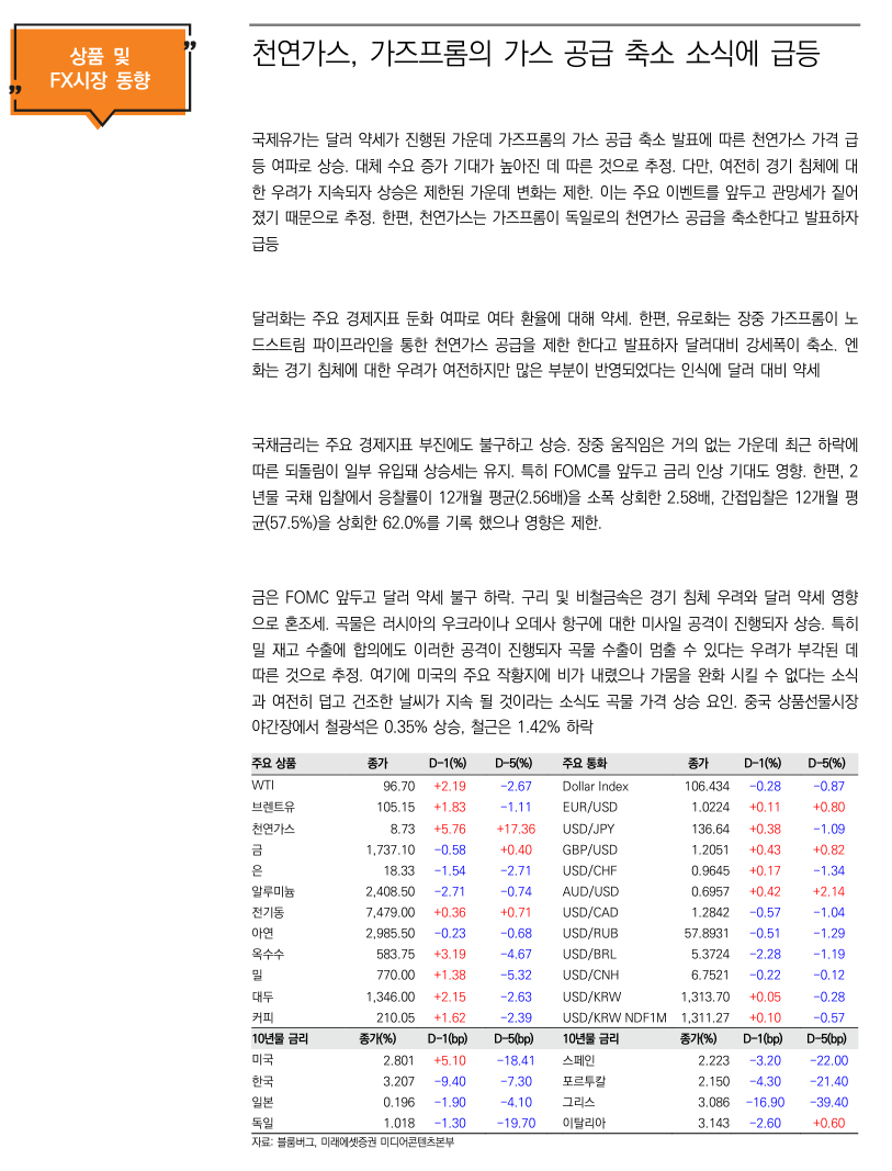금일 유럽증시는 관망세에 접어들며 혼조세로 마감 / 범유럽지수인 STOXX600는 0.1% 상승. 세부적으로는 에너지, 금융, 필수소비재 등의 섹터가 상승 마감하였고 부동산, 산업재, 건강관리 섹터가 하락 마감. 독일 DAX지수는 0.3% 하락한 13,210.32선에서 거래되었으며 FTSE 100지수는 0.4% 상승한 7,306.30에서 마감 / 지난주 부정적인 경제지표 결과에 의해 하락세로 마감하였던 유럽증시는 금일 미국의 7월 연방공개시장위원회(FOMC) 정례회의와 기업들의 실적 공개 등의 이벤트를 앞두고 혼조세로 장을 마감 / 현재 러시아로부터 공급되는 천연가스 양이 40%에서 오는 27일 20%수준으로 낮아질 것이라는 월 스트리트 저널의 예상이 제기되며 공급량에 대한 우려 또한 확산 / UBS, 도이치뱅크 등의 대형 은행들의 실적 발표 또한 증시에 영향을 줄 것이라는 전망 / 금일 발표된 경제지표로는 독일의 7월 IFO기업환경지수가 88.6을 기록하며 2020년 6월 이후 최저치를 기록 / 이는 기업들이 바라보는 경기가 악화되고 있음을 시사