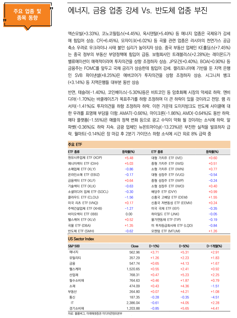 금일 섹터 ETF는 에너지(XLE/+3.7%) ETF가 강세를 보이며 마감. 미국 기업들의 실적 발표 시즌이 계속되는 가운데 에너지 관련 기업들의 실적 발표가 예정. 모건스탠리의 애널리스트에 따르면 시장에 변동성이 지속되고 있지만, 에너지 부문 섹터에 사상 최대 규모의 잉여현금흐름이 현금 수익 추가를 가속화 할 것으로 예상된다고 언급. 이에 따라 다이아몬드백 에너지(FANG/+5.8%)와 엑슨 모빌(XOM/+3.3%) 등의 정유기업 주가가 상승하며 마감. 반면, 자유소비재(XLY/-0.8%) ETF는 섹터 내 종목 제너럴 모터스(GM/-0.2%) 등이 부진하며 하락 마감.
