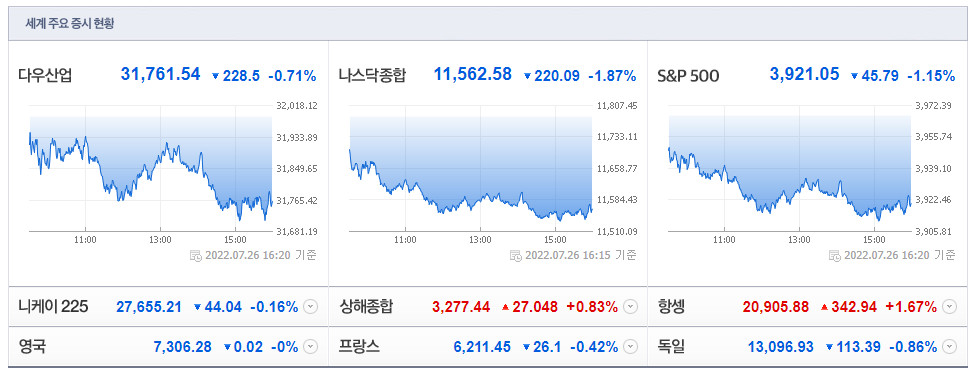 금일 미국 증시는 연방공개시장위원회(FOMC) 정례회의 결과를 주시하며 하락 마감. S&P500지수는 1.2% 하락한 3.921.05선에서 거래를 마쳤고, 다우지수는 31,761.54에 마감. 나스닥 지수는 1.9% 하락한 11,562.57에 마감. 금일 월마트(WMT/-7.6%)가 분기 및 연간 실적 전망치를 하향 조정하여 제시하였고 쇼피파이(SHOP/-14.0%)는 인원 감축을 발표함에 따라 장 중 큰 폭으로 하락하며 증시의 하락 마감을 주도. 또한, 금일 경기 악화를 시사하는 경제지표가 발표되며 증시에 영향. 금일 발표된 경제지표로는 미국의 7월 소비자신뢰지수가 95.7을 기록하며 97.0이었던 예상치를 하회. 미국의 7월 리치먼드 연은 제조업지수가 0을 기록하며 전월보다 개선된 수치를 나타냈지만, 6월 신규주택 판매가 전월 대비 8.1% 하락하며 주택시장 또한 어려움을 직면하고 있음을 시사. 한편, 금일 시작된 미국 연방공개시장위원회(FOMC) 정례회의의 결과가 한국 시간으로 28일로 예정된 가운데 연준(Fed)이 기준금리를 75bp 인상하는 자이언트 스텝 결정 여부와 오는 9월 추가 금리인상 폭의 가이던스를 제시할 것이라는 예측이 제기. 투자자들은 추가로 28일 발표 예정된 미국 2분기 국내총생산(GDP)와 아마존(AMZN), 애플(AAPL)의 실적 공개를 주시.