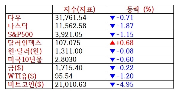 반도체주들도 엔비디아 2.885, 마이크론 0.81%, 필라델피아반도체지수 1.63% 등 일제히 하락 마감했다. 테슬라는 전거래일보다 3.57% 급락하며 776달러에 마감, 또다시 800달러선이 무너졌다.