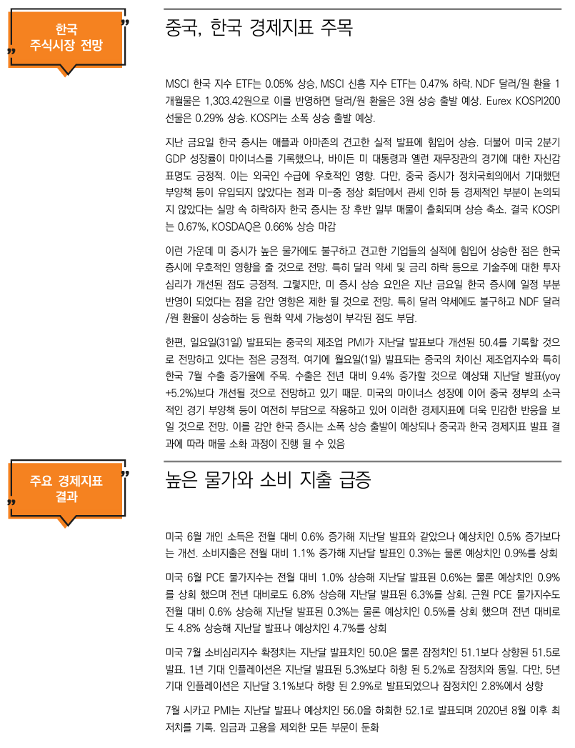 중국의 7월 제조업 PMI는 지난달 발표된 50.2를 하회한 49.0으로 발표돼 기준선인 50.0을 하회. 서비스업 PMI는 54.7에서 53.8로 위축. 최근 중국 정부의 소극적인 경기 부양정책에 이어 부진한 경제지표는 전반적인 투자심리 위축 요인으로 작용.