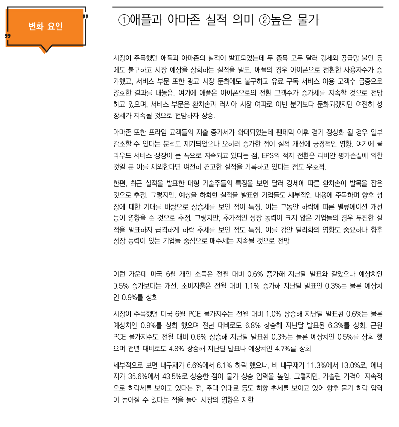 이번 주 화요일 장 마감 후 실적을 발표하는 AMD에 대해 PC 산업 위축 영향이 큰지, 또는 경쟁업체인 인텔의 부진의 수혜를 입었을 것인지 주목. 결과에 따라 변동성이 확대될 것으로 전망