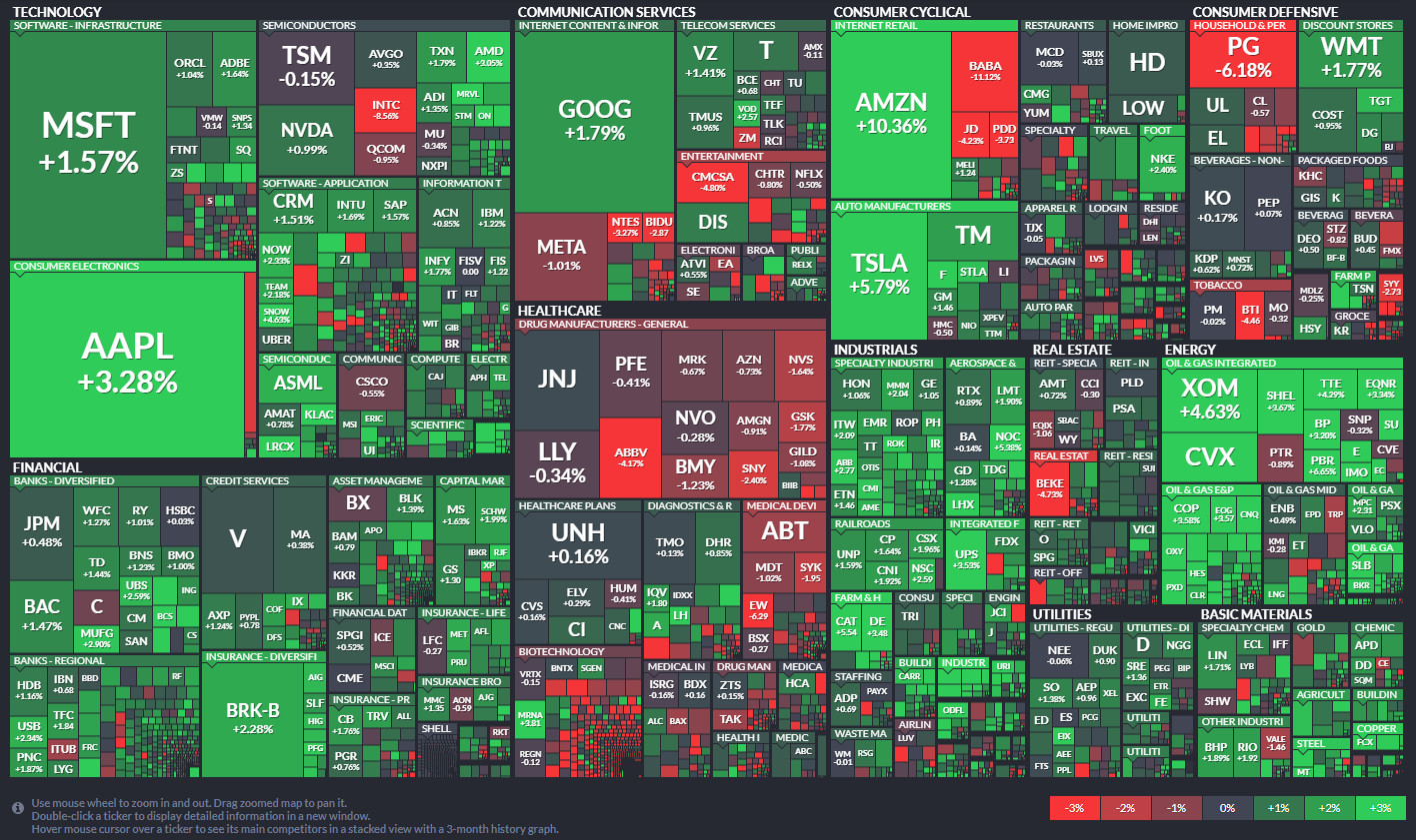 금일 섹터 ETF는 에너지(XLE/+4.3%) ETF가 상승 마감. 당 섹터 내 종목 셰브론(CVX/+8.7%)과 엑슨모빌(XOM/+4.7%)가 상승한 유가에 힘입어 지난 2분기 예상치를 상회하는 실적을 공개하였고 이에 따라 동 섹터 내 타 종목에도 상승 압력을 부여. 자유소비재(XLY/+3.9%) ETF는 아마존닷컴(AMZN/+10.3%)이 금일 공개한 실적이 호조를 보이며 급등하였고 당 섹터 ETF를 견인하며 마감. 반면, 헬스케어(XLP/-0.3%) ETF는 덱스컴(DXCM/-5.6%)가 지난 2분기 부진한 실적을 공개하며 당 ETF에 하방 압력.