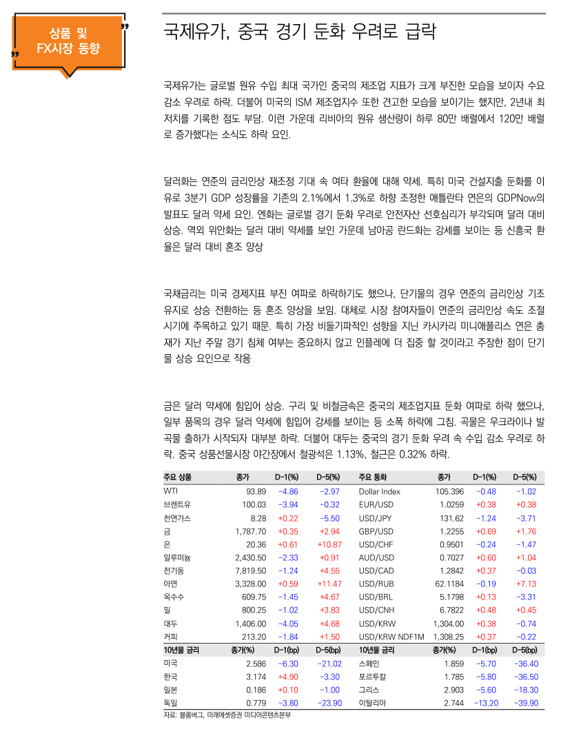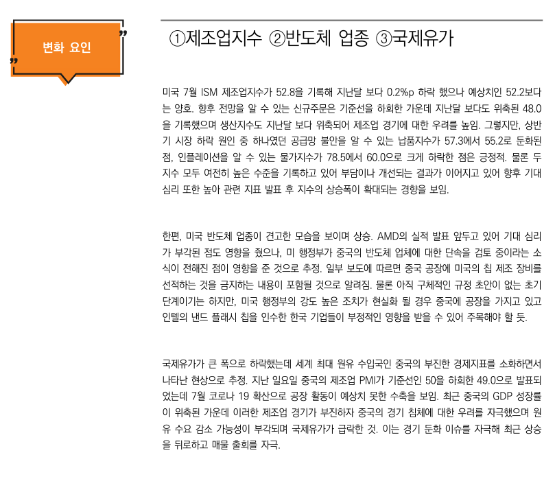 금일 미국 증시는 경제지표가 투자심리에 하방 압력을 가하며 하락 마감. S&P500지수는 0.3% 하락한 4,118.63선에서 거래를 마쳤고, 다우지수는 32,798.40에 마감. 나스닥 지수는 0.2% 하락한 12,368.98에 마감. AMD(AMD/+2.5%)의 실적 기대감에 힘입은 반도체주의 강세가 증시를 상승세로 이끌며 출발한 뉴욕 증시가 부정적인 경제지표가 연이어 발표되며 하락세로 전환하며 마감. 오는 2일 실적 발표 예정인 AMD는 최근 인텔(INTC/+1.8%)의 실적 부진이 당사에게 기회가 될 수 있다는 전문가의 분석이 제기되며 장 초반 반도체주의 상승세를 견인. 하지만 금일 발표된 경제지표에 의해 미국 경기 침체 우려가 확산. 금일 발표된 경제지표로는 미국의 공급관리협회(ISM)이 집계한 7월 제조업 구매관리자지수(PMI)가 52.8을 기록하며 2020년 6월 이후로 최저치를 경신. 7월 S&P 글로벌(마킷) 제조업 PMI 또한 52.2를 기록하며 2년만의 최저치를 기록. 추가로 미국의 6월 건설지출이 전월 대비 1.1% 감소하며 월 스트리트의 예상치를 크게 하회. 투자자들은 미 연준(Fed)의 금리 결정에 영향을 끼칠 미국의 고용지표를 주목. 미국의 고용보고서는 오는 5일 발표 예정.