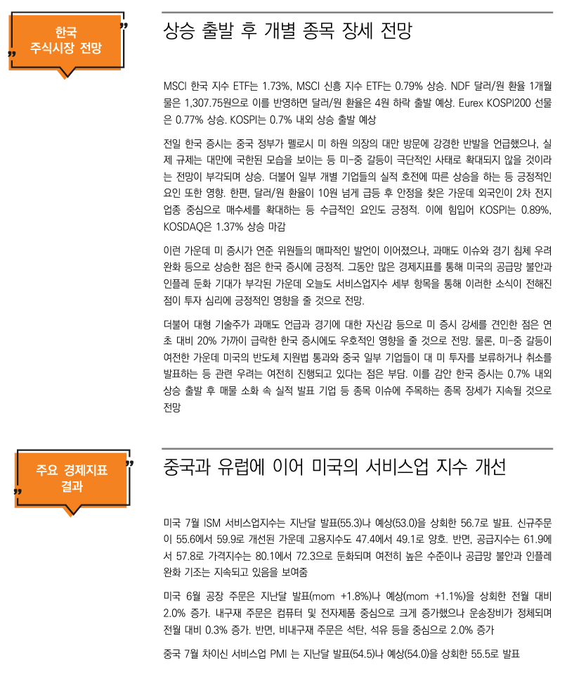 금일 미국 증시는 발표된 경제지표와 기업들의 실적 호조로 인한 상승 마감. S&P500지수는 1.6% 상승한 4,155.17선에서 거래를 마쳤고, 다우지수는 32,812.50에 마감. 나스닥 지수는 2.6% 상승한 12,668.16에 마감. 금일 실적을 공개한 AMD(AMD/-1.2%)가 예상치를 상회하는 지난 2분기 순이익을 달성하였지만 연간 가이던스는 월 스트리트의 예상을 하회하여 제시. 하지만 모더나(MRNA/+16.0%)와 CVS 헬스(CVS/+6.3%)가 실적 호조를 발표하며 증시의 상승세를 견인. 또한, 비록 금일 공개된 미국의 7월 S&P 글로벌 서비스업 구매관리자지수(PMI)가 47.3을 기록하며 2년만의 위축세에 접어들었지만, 7월 공급관리협회(ISM) 비제조업 구매관리자지수(PMI)가 56.7을 기록하며 전 월치를 상회하였고, 6월 공장재 수주는 전월 대비 2.0% 상승하며 전 월의 증가율을 상회. 추가로, 전문가들은 조 바이든 미국대통령이 OPEC+와 산유량 증산에 합의함에 따라 글로벌 경제에 부담이 줄어들 것이라는 분석을 제기.
